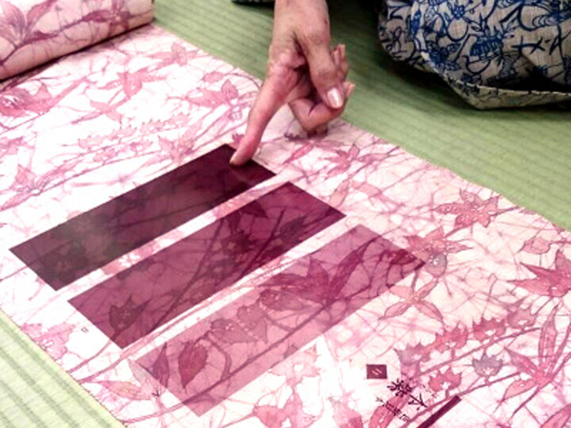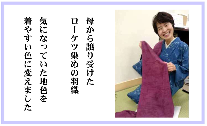 まずは、その着物についてお話を伺います。 自分で購入したのもの、誰かから譲られたもの、色々な経緯があると思います。 お話を伺うと、どのくらいの時代に仕立てられたものなのかや、着用頻度など、着物の状態と照らし合わせながら知ることが出来ます。 次に、なぜ相談にお持ちになったのか。 地色が気になる、柄の色が気になる、金彩など装飾が気になる、 しみを付けてしまった、黄変が出てしまった、など、どこを中心にお手入れをするか決めます。 ゑり華のお手入れは、直して終わりではありません。 直したものが着られる方法を一緒に考えます。 今回は、お母様から譲り受けたローケツ染めの羽織です。 地色の白が気になっていて、なかなか袖を通せずにいました。 クリニックキャンペーンで橋村さんに相談して、上から紫色をかける無地染めをすることに。