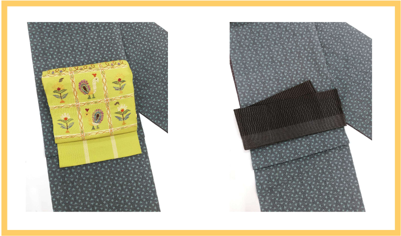 右はシックに黄八丈の半巾帯です。