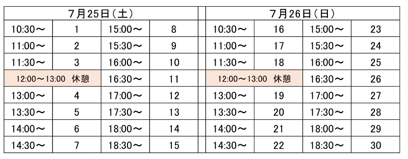 ◆ご希望の時間帯(下記表の数字からお選びください)