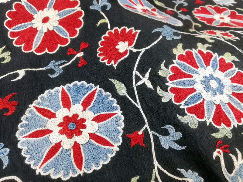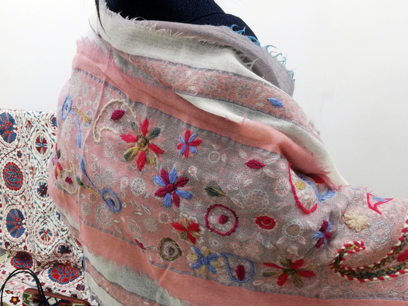シルクロード周辺の伝統刺繍「スザニ」やマーブル染「エブル」など、キリム以外の染織品もあります。