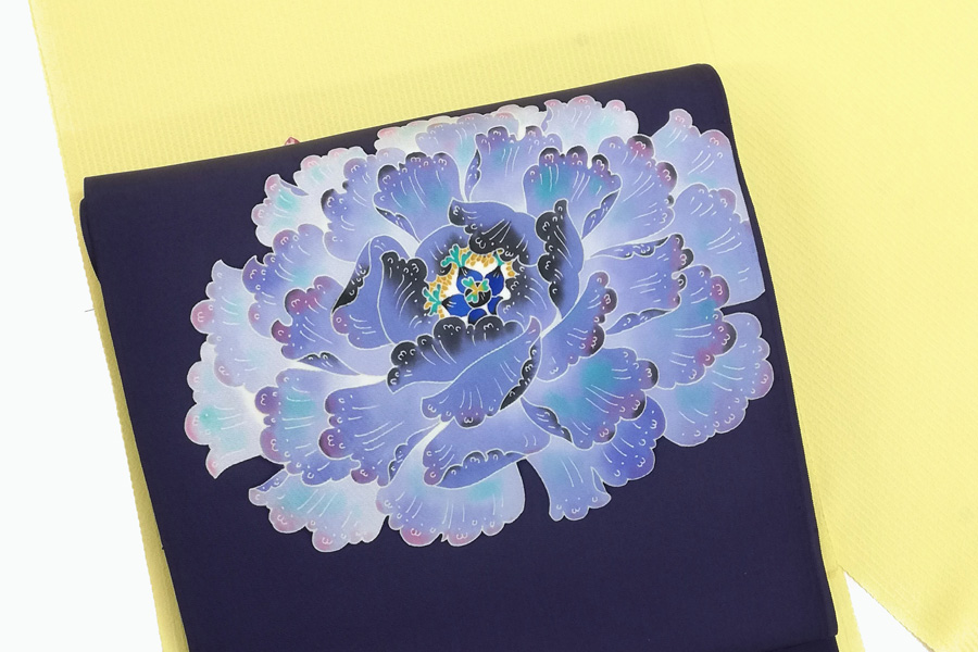濃い紫紺色の地に淡い紫濃淡のぼたんの花。