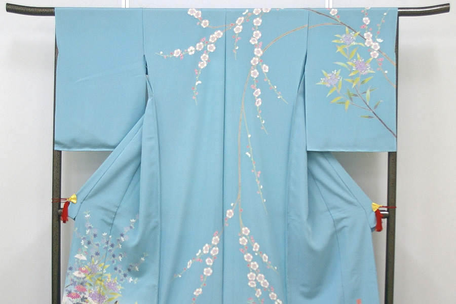 地色は明るいブルー。しっかりと白を入れて重みを持たせてありますので、華やかな中にも落ち着きが出ますので、末永くお召しいただけると思います。