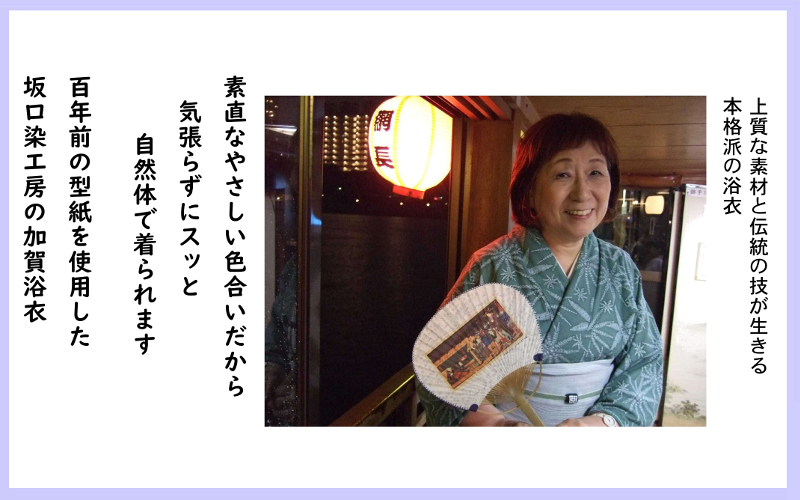金沢で唯一の板場友禅である坂口さんの「加賀古代染浴衣」は、先々代から大切に保管している型紙を使用した”今にはない”柄と、2枚の型紙を違う色で染めることによって生まれる色彩が魅力です。古典的でいて新しい、他にはない唯一の浴衣です。