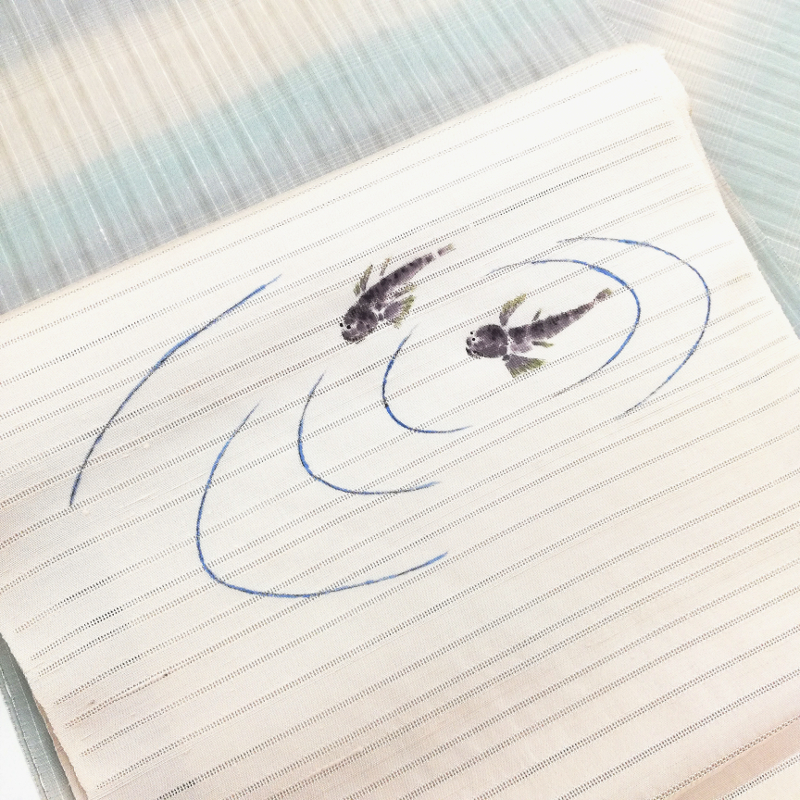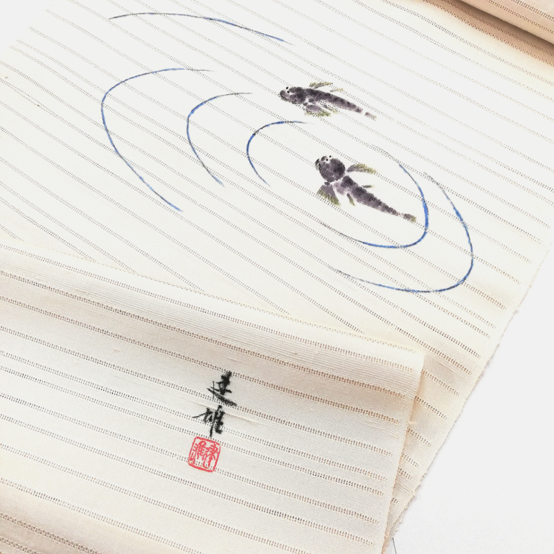こちらの染帯、波紋に鮴(ごり)を描いてもらいました。