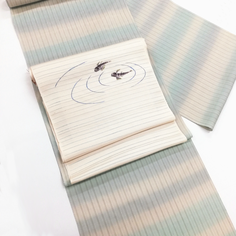 こちらの染帯、波紋に鮴(ごり)を描いてもらいました。
