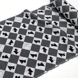 スコティッシュテリアの白黒わんこ(違っていたらすみません)がダイヤとドットに囲まれていて、お洋服感覚で気軽に遊べるお襦袢です。
