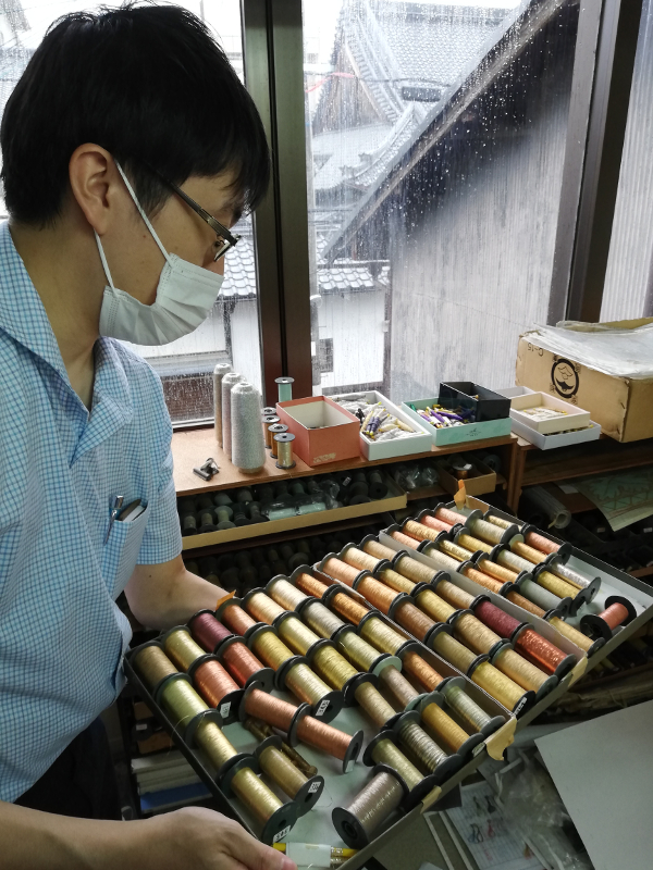 一色に見える色でも何色もの糸を紡ぎ合わせたり、金銀糸、箔などのさまざまな材料を合わせることによりさらに生きた色調になり、芯の色はより深まっていくのです。