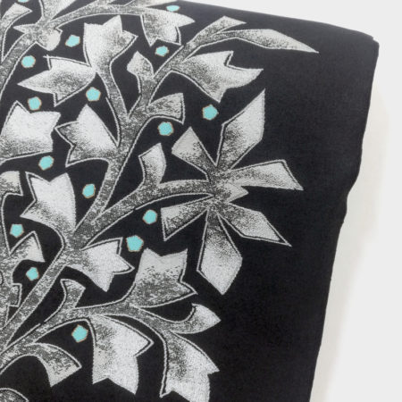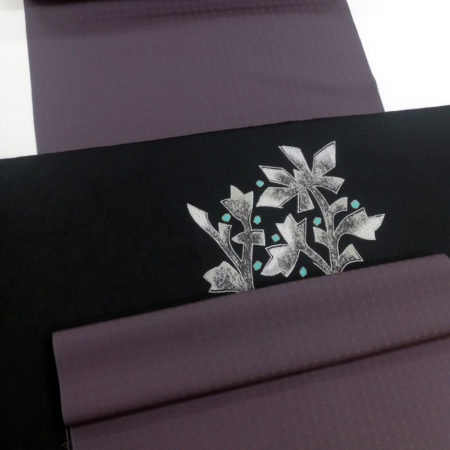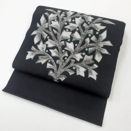 シンプルな樹木のお太鼓柄に見えますが、立体感のある陰影や光の煌めきをバランス良く織りで表現しています。