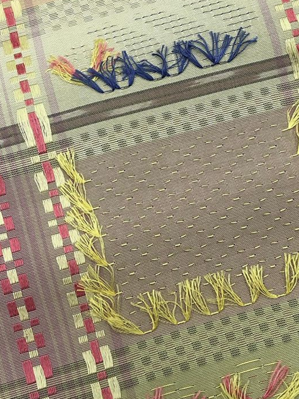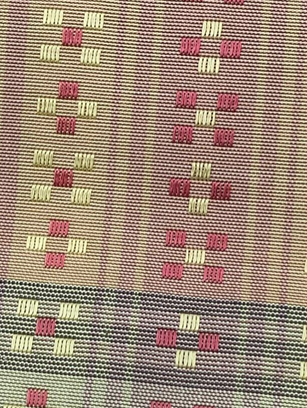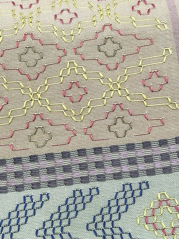 こちらの金良さんの作品は、伝統的な経て花に、綜絖を使わないで手で糸を織り込む「てぃー花」と、更に緯糸浮かせる花も使っています。