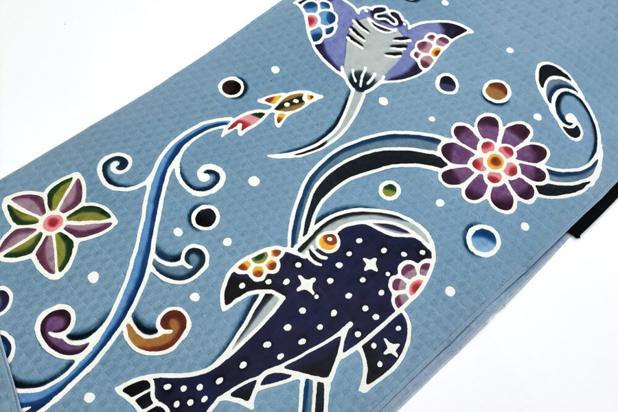 通常の紅型と違う点は、型紙を使わずフリーハンドで描くことです。