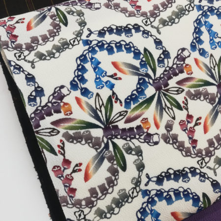 こちらの帯では紫から青みがかった色で染められ、細長い葉は深緑からグレー、オレンジのグラデーションで彩られています。