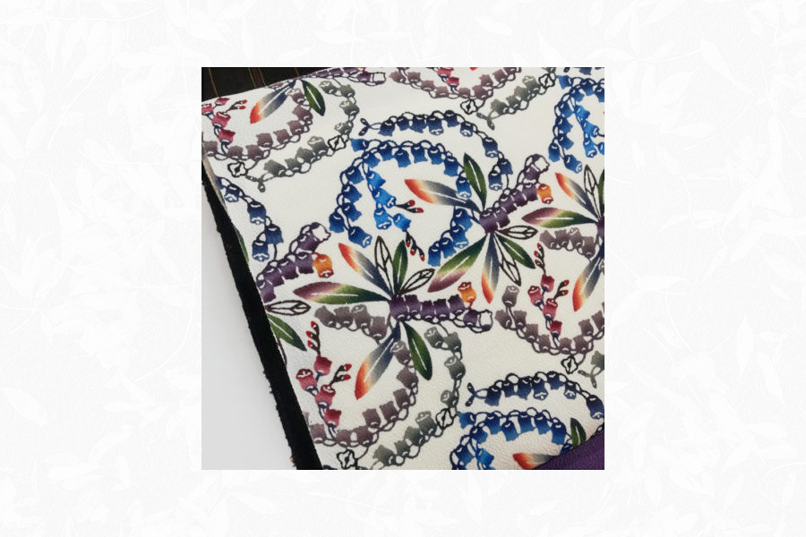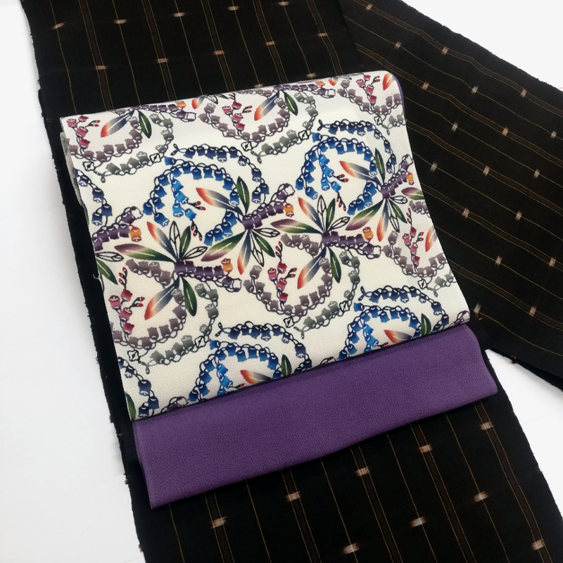 こちらの帯では紫から青みがかった色で染められ、細長い葉は深緑からグレー、オレンジのグラデーションで彩られています。
