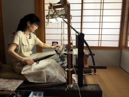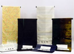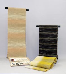 小千谷では豊かな自然に恵まれた土地で、良質な紙・柿渋・栗・松などから、紙布・栗繭・柿渋染・松煙染などが行われ、表情豊かな紬や帯が作られています。