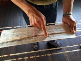 玉繭と真綿の手紡糸から織られる生地は、艶やかな光沢と柔らかな風合いで、着減りしない丈夫さも特徴です。柄は木羽定規を使った色数が多い絵絣が目を引きます。