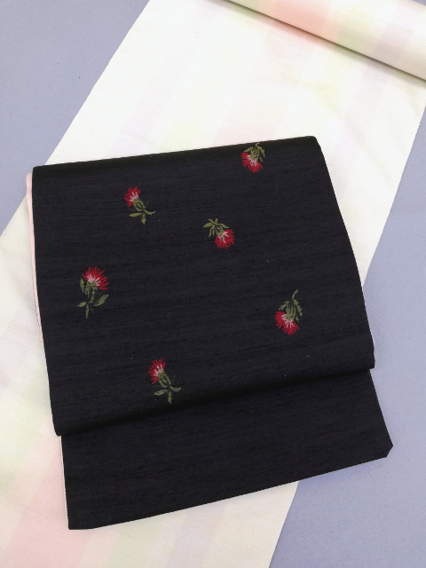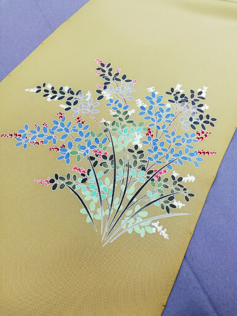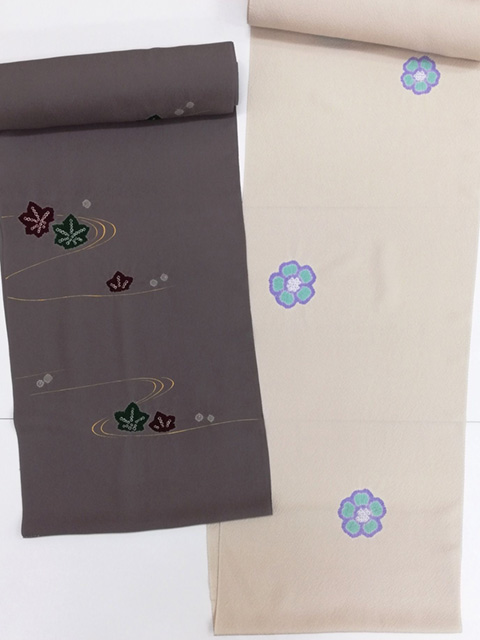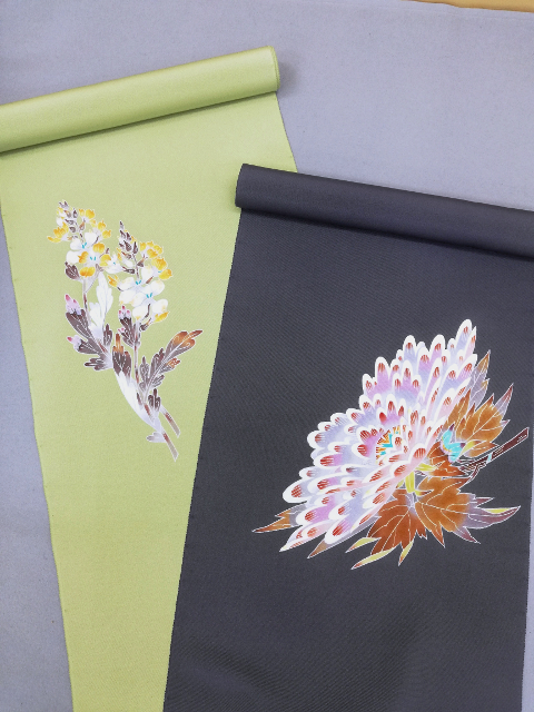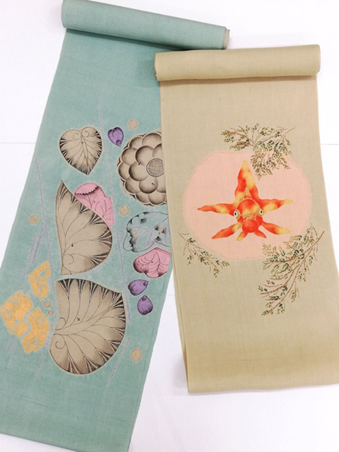 志田弘子作 加賀友禅九寸帯〈左〉ごま菜〈右〉牡丹