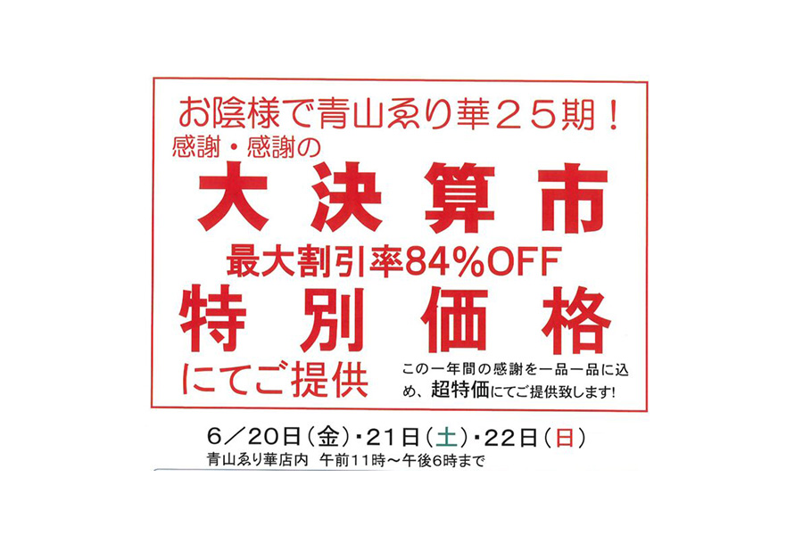 お待たせいたしました青山ゑり華25回目の大決算市のお知らせです。