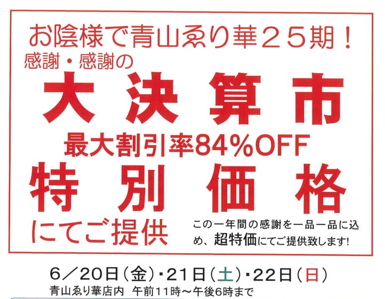お待たせいたしました青山ゑり華25回目の大決算市のお知らせです。