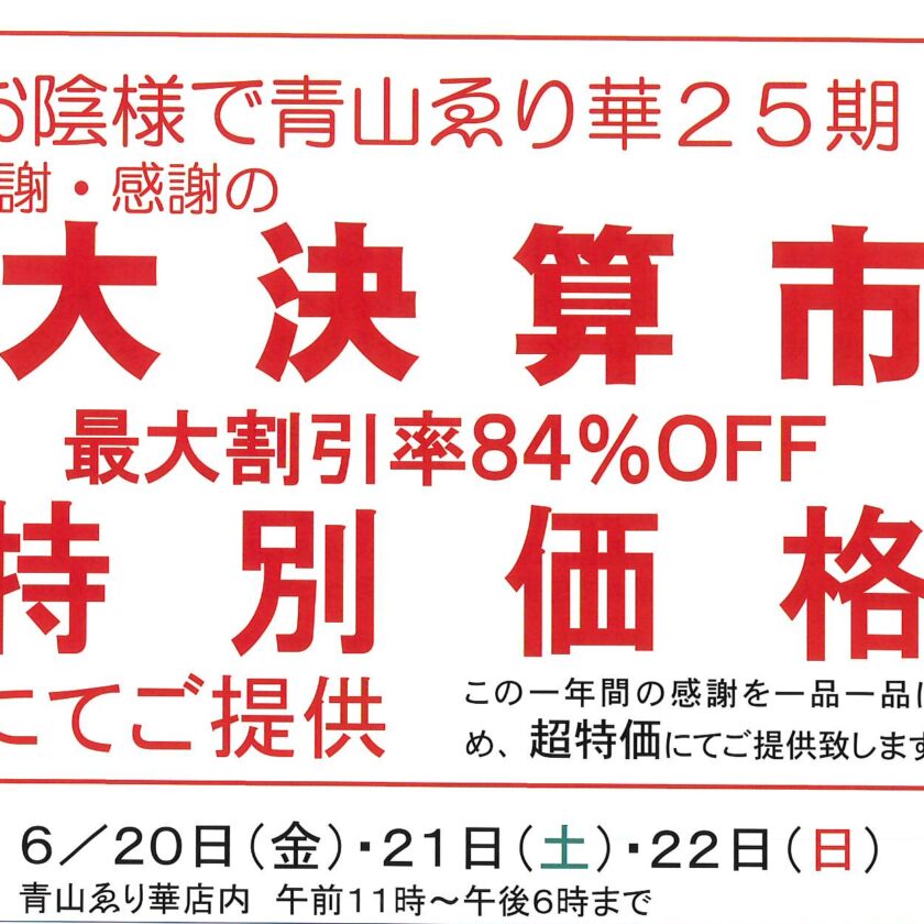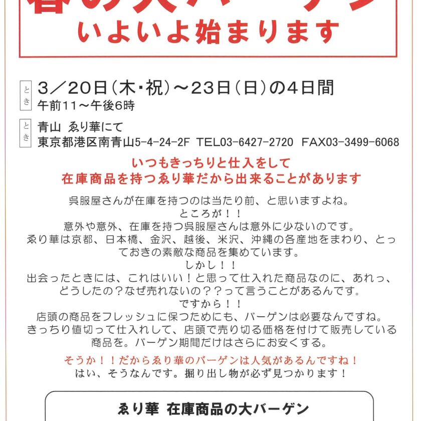 ニュース 一覧 6月20日(金)~22日(日)大決算市 大決算市 6月20日(金)から22日(日) 11:00~18:00 青山ゑり華 店内にて ご挨拶 通... 春の大バーゲンのお知らせ こんにちは、青山ゑり華の花岡です。 久しぶりのイベント情報の更新です。 4月から店頭は夏物を中心に展... 栗山工房 麻九寸名古屋帯 栗山工房 麻九寸名古屋帯 大人気 栗山工房の麻帯が今年は3反入荷しました 京都高雄にある栗山工... 3/14日(木)~17日(日) 春の大バーゲン こんにちは、花岡です。 もう三月ですね、今は寒くても三月になればだんだんと暖かい日が増えてきます。 ... 年末年始のお知らせ こんにちは。 ゑり華の通常営業は本日が年内最終日です。 本年も格別のご愛顧を賜り厚くお礼申し上げます... お盆期間の営業日のお知らせ いつも青山ゑり華をご愛顧頂きありがとうございます。 8月11日(金・祝)まで通常営業 8月12日(土... 6/22日(木)~25日(日) 大決算市 青山ゑり華23回目の決算を迎えることになりました。 ここまでやってこられたのも貴方様のご支援あっての... 3/17日(金)~20日(月) 春の大バーゲン こんにちは、花岡です。 もう三月ですね、今は寒くても三月になればだんだんと暖かい日が増えてきます。 ... 3月のゑり華イベント 扇エクササイズ 日本舞踊の綺麗な動きに、ヨガのシェイプアップ効果と柔軟性をミックスしました。 日時:... 2月のゑり華イベント 扇エクササイズ 日本舞踊の綺麗な動きに、ヨガのシェイプアップ効果と柔軟性をミックスしました。 日時:... 1月のゑり華イベント 新春恒例!ちょこっと金沢気分 着物で新年会 2023年1月14日(土)・15日(日)2日間 ... 年末年始のお知らせ こんにちは。 クリスマスを過ぎると、一気に年末モードですね。 ゑり華の通常営業は本日が年内最終日です... 12月のゑり華イベント 第159回お香の会 12月17日(土)「贈答香」(ぞうとうこう) お歳暮の季節にちなんで、「贈答」が... 丹後ブルー小林染工房 小林知久佐展 小林知久佐展 10月14日(金)~17日(月)4日間(最終日は15時半まで) 期間中 小林さん滞在 ... 10月のゑり華イベント 小林知久佐展 10月14日(金)~17日(月)4日間(最終日は15時半まで) 期間中 小林さん滞在 ... 帯屋捨松作品展 創業安政元年160年の歴史 帯屋捨松作品展 9月23日(金)~26日(月)4日間(最終日は15時半ま... 9月のゑり華イベント 扇エクササイズ 今月はお休みです お香の会 9月10日(土)14時から 「月見香」(つきみこう) 中... 夏期休業のお知らせ いつも青山ゑり華をご愛顧頂きありがとうございます。 今年は夏期休業を頂きます。 8月12日(金)まで...