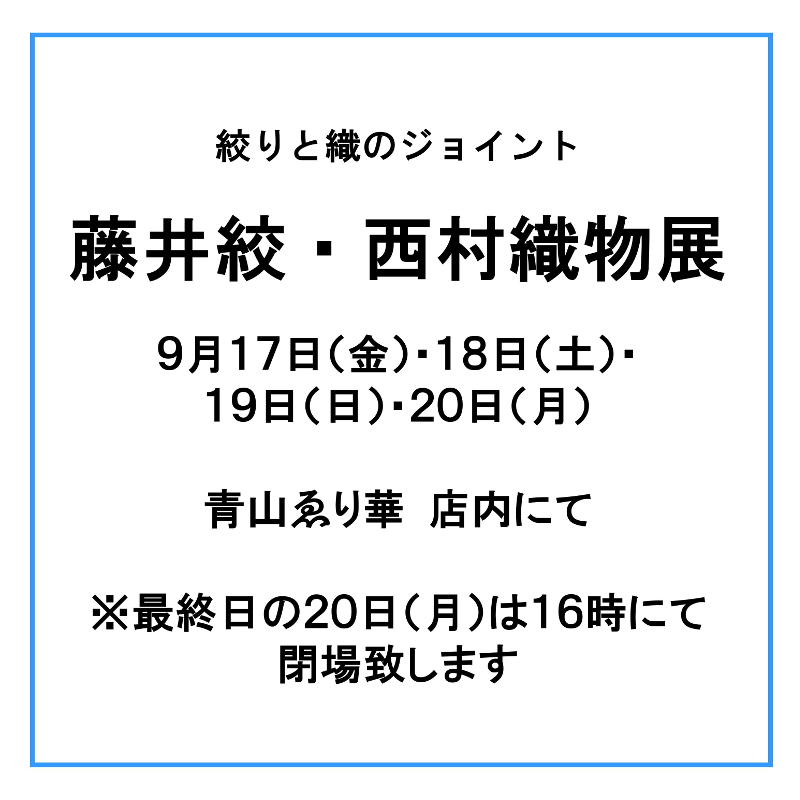 9月17日(金)・18日(土)・19日(日)・20日(月) 青山ゑり華 店内にて ※最終日の20日(...