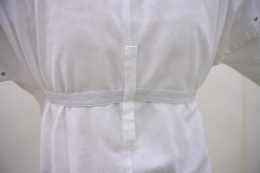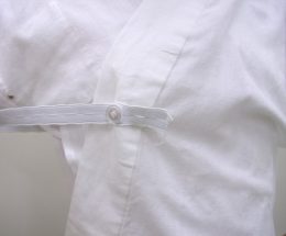 ゴムひもがついておりまして、右衿下部から左の身八つを抜け、背中のループを通せば衿が抜けます。ゴムは巾2cmあり、中央にボタンホールがずーっとつながっていて、どこでも留めることができます。