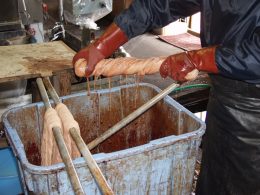 柿渋は染めた後天日に干します。光に当てると赤外線の力で発色するのです。