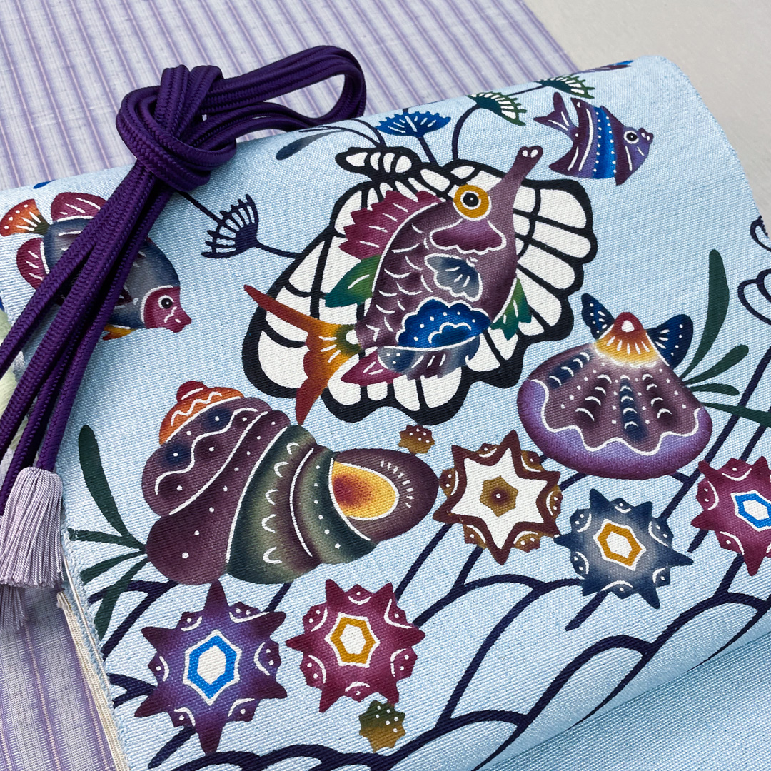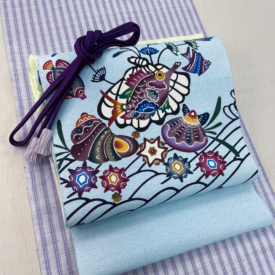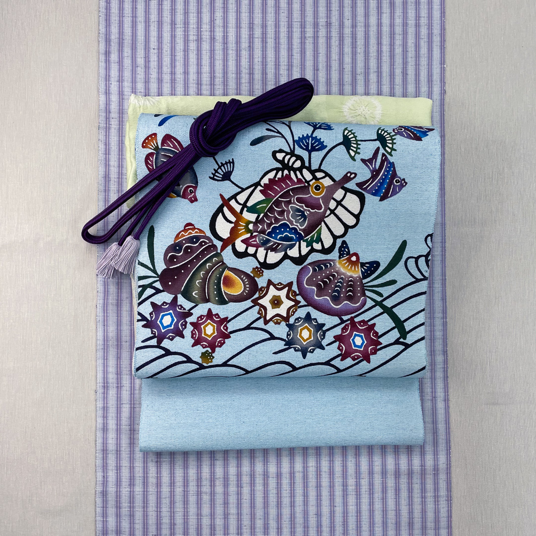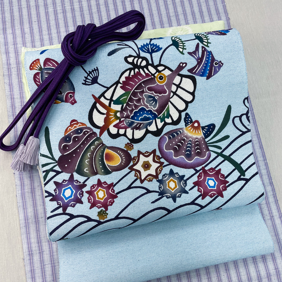 愛らしいフエフキヤッコや熱帯魚たちが色鮮やかに描かれていますが、色使いは上品で爽やか。帯地のブルーと調和して、夏らしい軽やかな印象を与えてくれます。伊那紬のしっかりとした生地に染められており、締めやすさも魅力のひとつです。