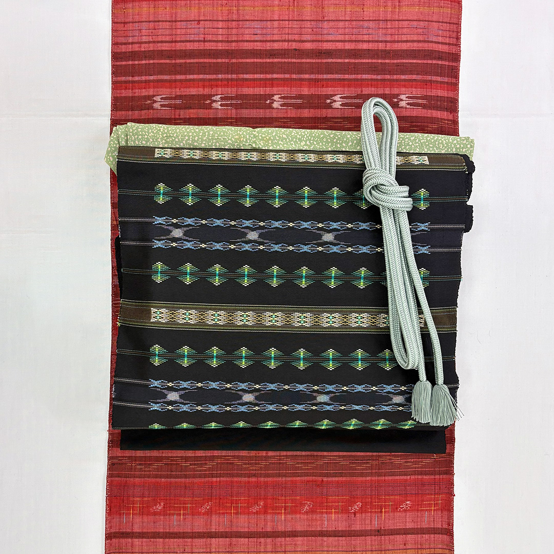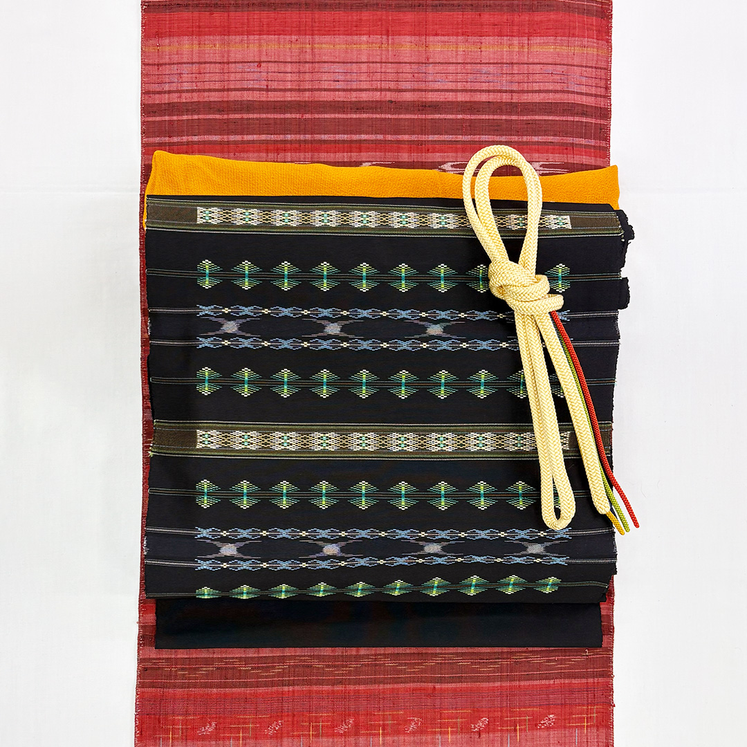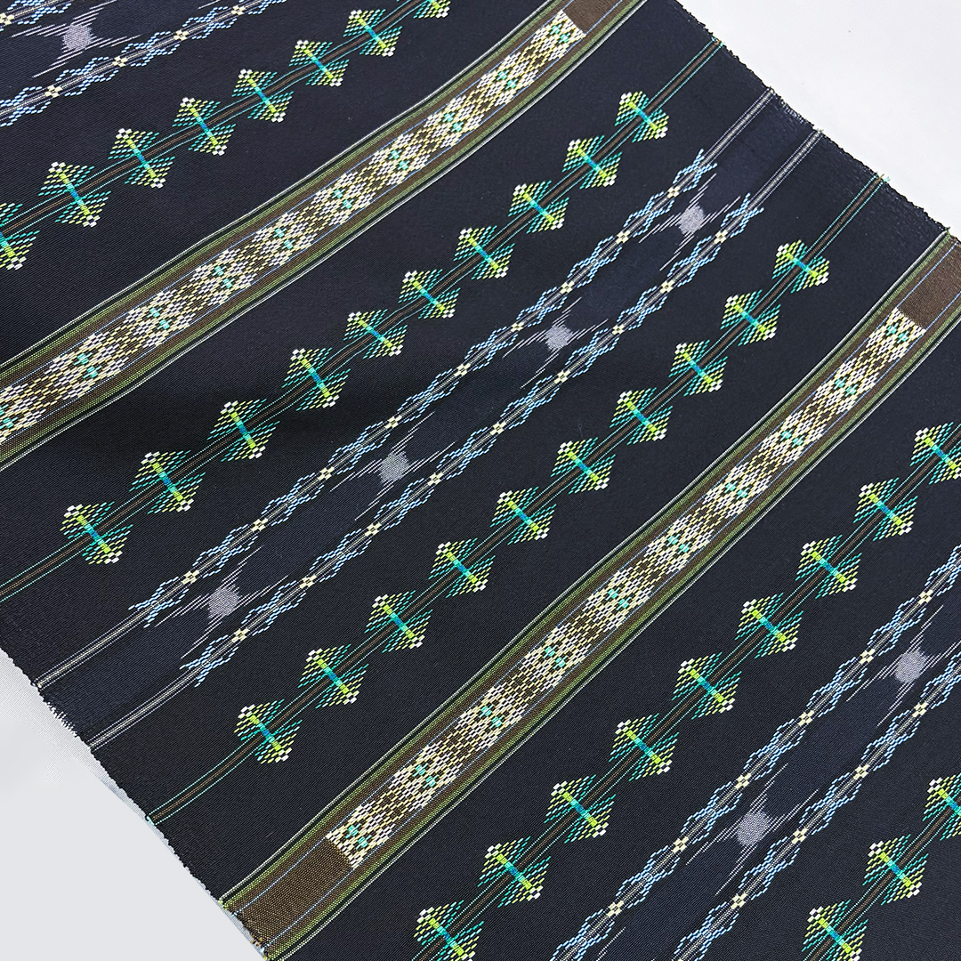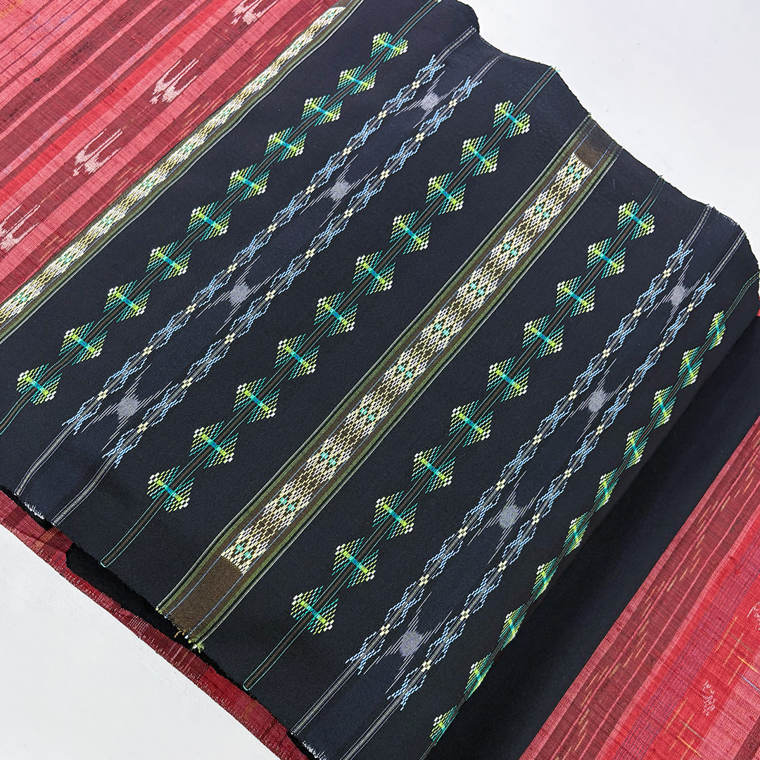 漆黒の地に鮮やかな絣模様が映え、瑞々しい色彩の花織がふわりと浮かび上がる一条。